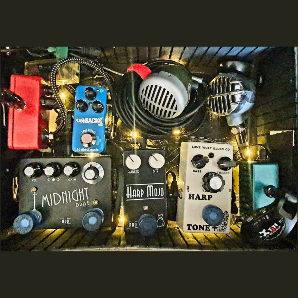 Sistima inalámbrico Xvive –> Eq gráfico –> Lone Wolf Harp tone+ –> Rod Harp Mojo –> Rod Midnight –> Tc electronic Flashback mini Delay –> Tc electronic HAF mini reverb –> al amplificador.